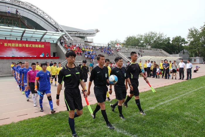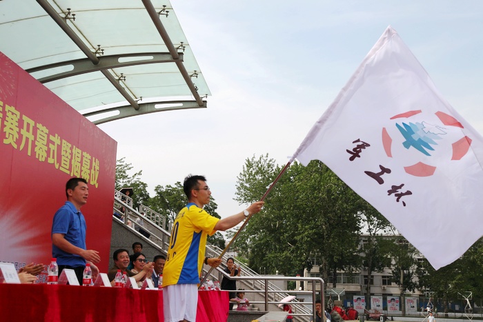 趙剛和趙長祿共同為足球賽揭幕戰(zhàn)開球。