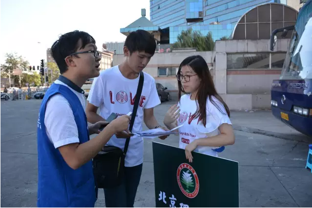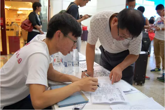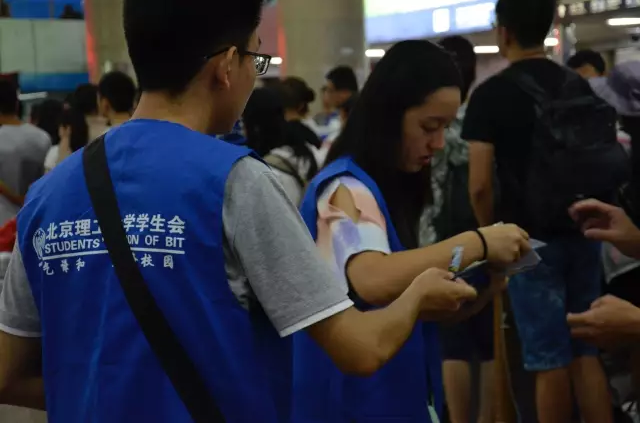 ▲北京南站,我們的志愿者在自印的地鐵圖上為家長(zhǎng)標(biāo)出路線(xiàn)。偌大的北京城,地鐵線(xiàn)雖然錯(cuò)綜復(fù)雜,但我們總會(huì)選出最優(yōu)方案,幫助新生和家長(zhǎng)最快的到達(dá)目的地。