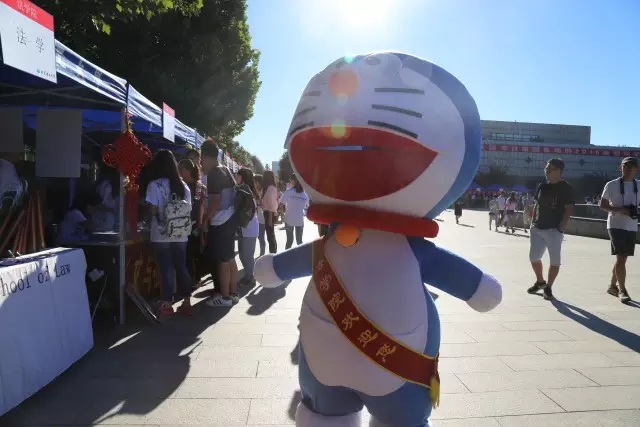 學(xué)長(zhǎng)們不顧烈日高溫,扮演哆啦A夢(mèng)玩偶與新生互動(dòng),成為今天全校整個(gè)迎新現(xiàn)場(chǎng)的最大萌寵。