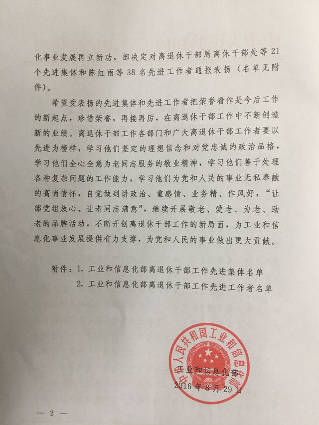 日前,工業(yè)和信息化部隆重召開離退休干部工作“雙先”暨離退休干部“正能量之星”表彰大會。部黨組書記、部長苗圩為大會寫來賀信,部黨組成員、副部長、部離退休干部工作領(lǐng)導(dǎo)小組組長劉利華出席大會并講話,部辦公廳、財務(wù)司、人事教育司、直屬機(jī)關(guān)黨委、機(jī)關(guān)服務(wù)局、離退休干部局領(lǐng)導(dǎo)以及工業(yè)和信息化部原老領(lǐng)導(dǎo)出席大會。我校離退休工作處榮獲“工業(yè)和信息化部離退休干部工作先進(jìn)集體”榮譽稱號,離退休工作處饒曉煒、周瑩榮獲“工業(yè)和信息化部離退休干部工作先進(jìn)工作者”稱號。