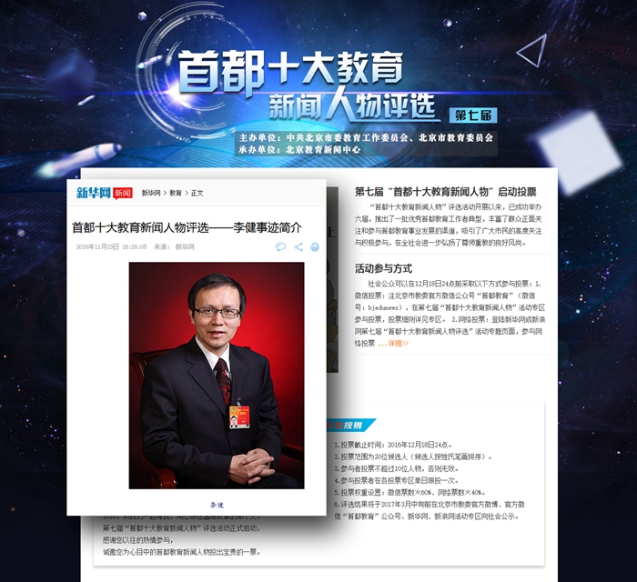 2016年12月5日,第七屆“首都十大教育新聞人物”評(píng)選活動(dòng)啟動(dòng),北京理工大學(xué)李健教授入選本屆評(píng)選活動(dòng)候選人。