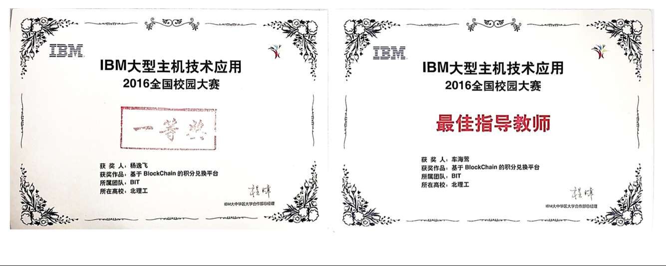 2016年12月8日,IBM大型主機技術(shù)應(yīng)用2016全國校園大賽決賽在北京中奧馬哥孛羅大酒店圓滿落幕。北京理工大學(xué)軟件學(xué)院車海鶯老師帶領(lǐng)的7名研究生、本科生組成的團隊研發(fā)的“基于區(qū)塊鏈的積分交易平臺”作品,經(jīng)過預(yù)賽環(huán)節(jié)多名專家長達(dá)一個多月的嚴(yán)格評審,進(jìn)入全國總決賽,決賽期間經(jīng)過“現(xiàn)場展示”和“自由發(fā)揮”兩個環(huán)節(jié)的激烈角逐,不負(fù)眾望,憑借深厚的主機應(yīng)用能力和行業(yè)領(lǐng)先的區(qū)塊鏈技術(shù)獲得各評委專家的高度評價,最終榮獲了本次大賽的團隊賽冠軍,團隊指導(dǎo)教師車海鶯老師獲得最佳指導(dǎo)教師獎。