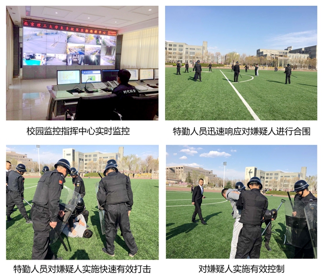 反恐防暴應(yīng)急演練采用實景模擬形式,從校園巡邏人員發(fā)現(xiàn)可疑人員進行盤問開始,到嫌疑人挾持一名學(xué)生試圖逃離,通過啟動校園反恐防爆預(yù)案和聯(lián)動機制,迅速通過監(jiān)控技術(shù)手段監(jiān)視嫌疑人動向,校區(qū)安全特勤人員迅速抵達現(xiàn)場,采用可控有效手段對嫌疑人進行打擊,直至完成有效控制。整個演練程序完備、準備充分、一氣呵成。