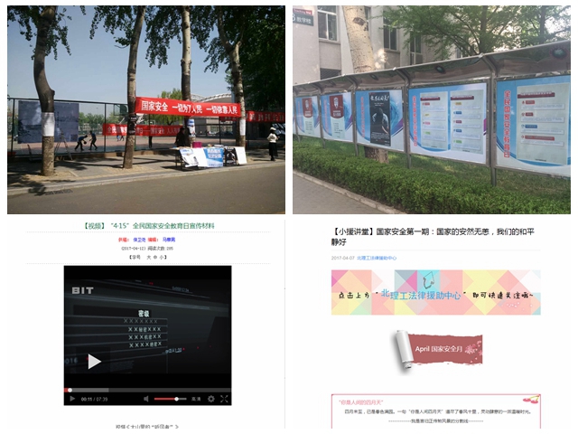 2017年4月15日是我國(guó)“全民國(guó)家安全教育日”,北京理工大學(xué)黨委高度重視,黨委宣傳部、保衛(wèi)部、學(xué)生工作部和法學(xué)院共同舉辦了《國(guó)家安全法》、《反恐怖主義法》、《反間諜法》等相關(guān)法律法規(guī)的普法和宣傳活動(dòng)。