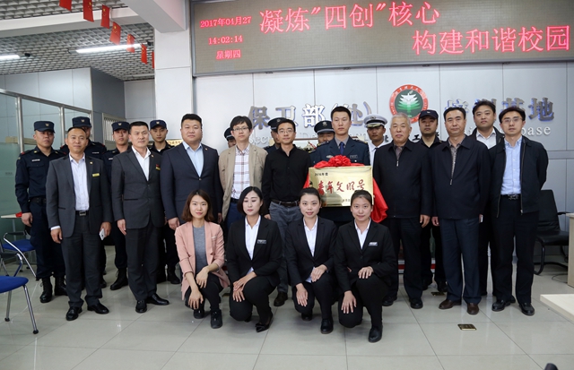 張秀峰和李和章共同為“青年文明號”揭牌。儀式前,校保安隊(duì)隊(duì)長陳愛國就我校“青年文明號”創(chuàng)建工作進(jìn)行匯報(bào),相關(guān)領(lǐng)導(dǎo)一行對校保安隊(duì)代表進(jìn)行了慰問。