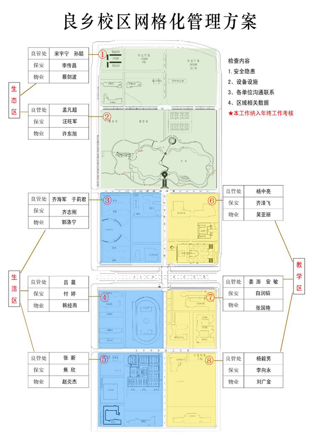安全保衛(wèi)中心主任宋宇寧介紹了校園網(wǎng)格化管理方案,根據(jù)根據(jù)良鄉(xiāng)校區(qū)的實(shí)際情況,按照分片管理的原則,將網(wǎng)格化管理工作劃分為一、二、三級(jí)網(wǎng)格,包括良管處、物業(yè)以及保安人員在內(nèi)進(jìn)行網(wǎng)格劃分。所屬區(qū)域人員與相關(guān)單位聯(lián)系,做好基礎(chǔ)數(shù)據(jù)的建設(shè),明確工作內(nèi)容并做好巡查記錄,定期召開(kāi)工作例會(huì)解決問(wèn)題并交流經(jīng)驗(yàn)。良管處副處長(zhǎng)霍俊斌對(duì)網(wǎng)格化管理的相關(guān)要求進(jìn)行了補(bǔ)充。