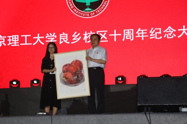 北京理工大學校長、中國科學院院士胡海巖代表學校接受了在校生代表,設計與藝術學院高楚同學為良鄉(xiāng)校區(qū)十周年創(chuàng)作的藝術作品,并宣布北京理工大學良鄉(xiāng)校區(qū)十周年紀念活動開幕!