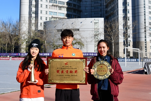 11月29日,中華人民共和國(guó)第十三屆學(xué)生運(yùn)動(dòng)會(huì)北京代表團(tuán)表彰大會(huì)在清華大學(xué)舉行。北京市教委、北京市體育局、共青團(tuán)北京市委和北京市大學(xué)生體育協(xié)會(huì)相關(guān)領(lǐng)導(dǎo)出席。在表彰會(huì)上,北京市代表團(tuán)授予我校 “突出貢獻(xiàn)獎(jiǎng)”,授予我校足球隊(duì) “最佳拼搏獎(jiǎng)”。