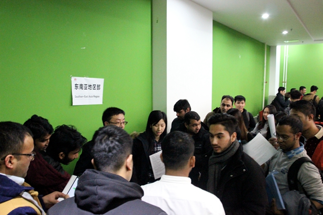 招聘會(huì)第二部分是分區(qū)域收取簡(jiǎn)歷并解答問(wèn)題,留學(xué)生們表現(xiàn)十分踴躍。現(xiàn)場(chǎng)分為東南亞地區(qū)部、中東地區(qū)部、南非地區(qū)部及其它區(qū)域。留學(xué)生們都手持自己精心準(zhǔn)備好的自薦書和簡(jiǎn)歷,積極與華為公司招聘人員進(jìn)行交流。