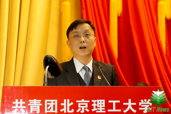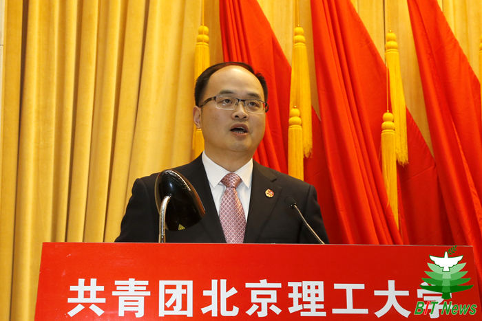 李驥代表共青團中央講話。他表示,北京理工大學是中國共產(chǎn)黨創(chuàng)辦的第一所理工科大學,七十多年來,北京理工大學各級團組織緊緊圍繞學校中心工作和青年發(fā)展需要,充分發(fā)揮自身優(yōu)勢,切實履行基本職能,取得顯著的成績。他對北理工共青團務(wù)實扎實的工作作風、極具特色的品牌活動、涵蓋全面的工作理念、大膽創(chuàng)新的工作形式、蓬勃向上的青年精神狀態(tài)表示了充分肯定。他指出,新形勢新挑戰(zhàn)下,共青團承擔著團結(jié)青年一代的神圣使命和重大責任。他表示,希望共青團組織抓住機遇、砥礪前行,將學習宣傳貫徹黨的十九大精神作為當前和今后一個時期的首要政治任務(wù),發(fā)揮好共青團在“大思政”格局中生力軍的作用,同時要著力推動團學改革攻堅,抓緊抓實從嚴治團,培養(yǎng)廣大團員青年成為新時代合格的社會主義接班人。