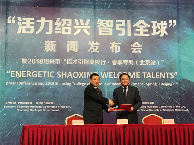3月24日下午,“活力紹興 智引全球”新聞發(fā)布會暨2018紹興市“招才引智高校行?春季專列(北京站)”活動在友誼賓館舉行。會上,王曉鋒代表學(xué)校同紹興市簽訂了“人才智力校地合作”協(xié)議書。