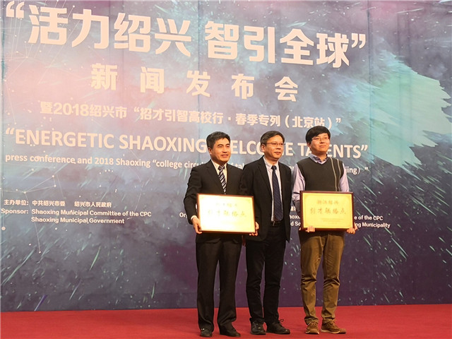 紹興市還向?qū)W校授予了“浙江紹興引才聯(lián)絡(luò)點”牌匾,招生就業(yè)工作處處長李振鍵接受了頒牌。