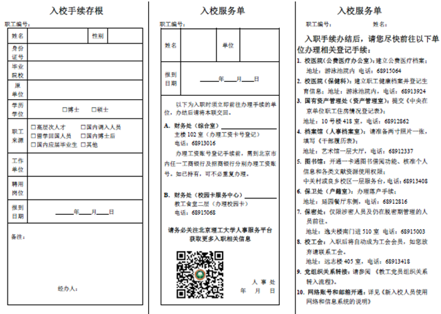 編輯:馬瑤 審核:閻艷 王征 閱讀次數(shù):到人事處開具“入校服務(wù)單”,領(lǐng)取入職資料包,然后再到財務(wù)處登記工資賬號,辦理校園一卡通,僅僅需要簡單的兩個步驟,新入職的A系列教職工就可以輕松成為北京理工大學的一員了。