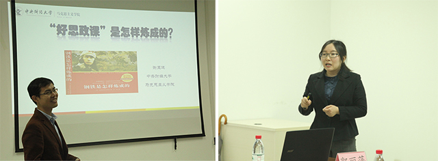 本次比賽分為開(kāi)幕式、主題報(bào)告、教學(xué)展示、專家點(diǎn)評(píng)四個(gè)部分。比賽伊始,院長(zhǎng)李林英介紹各位專家及比賽背景。接下來(lái),謝玉進(jìn)以“‘好思政課’是怎樣煉成的”為主題,并結(jié)合實(shí)際案例講述“好的思政課”是磨、闖、研、改、美出來(lái)的;穆阿妮以“比賽促教,夯實(shí)‘青椒’的基本功”為主題,從樹(shù)立精品課意識(shí)、練就基本功、包裝等角度進(jìn)行講述。