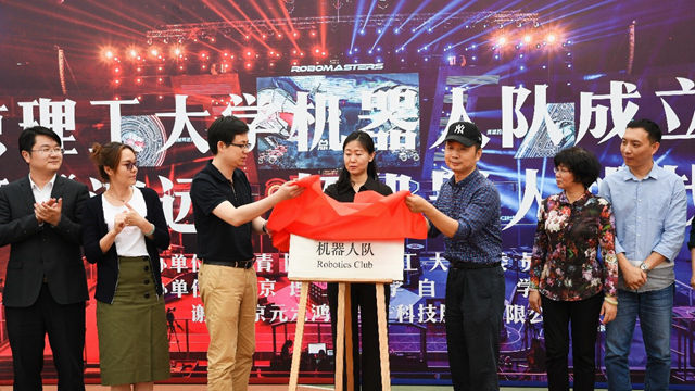 包麗穎宣布北京理工大學機器人隊正式成立,肖雄、金軍為機器人隊揭牌。自動化學院教師劉偉、金林劍受聘為機器人隊指導教師,機電學院2014級本科生張巖、信息與電子學院2014級本科生羅程豐、自動化學院2014級本科生王炎、2015級本科生潘淼鑫受聘為機器人隊隊長、副隊長。