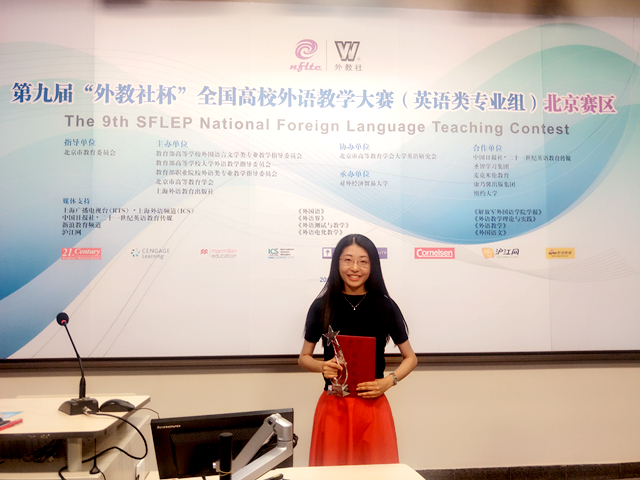 6月9日至10日,第九屆“外教社杯”全國高校外語教學大賽北京賽區(qū)的復賽及決賽在對外經(jīng)貿(mào)大學舉行。本次比賽分為英語專業(yè)組和商務(wù)英語組,來自北京市40余所高校的50余名優(yōu)秀教師參加角逐。北京理工大學外國語學院選派了曾在今年4月學院青年教師教學基本功比賽中教學演示環(huán)節(jié)榮獲一等獎的青年教師劉露,代表北京理工大學參加英語專業(yè)組的比賽。在為期兩天緊張而激烈的賽程中,劉露老師以優(yōu)美流暢的語音語調(diào)和邏輯嚴謹?shù)恼n堂設(shè)計,在復賽的講課環(huán)節(jié)和決賽的說課環(huán)節(jié)脫穎而出,最終斬獲英語專業(yè)組特等獎,即將代表北京賽區(qū)參加11月的全國決賽。