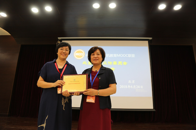 中國高校計(jì)算機(jī)教育MOOC聯(lián)盟副秘書長(zhǎng)、清華大學(xué)劉強(qiáng)教授代表聯(lián)盟向北京市工作委員會(huì)授牌,北京市工作委員會(huì)主任、北京理工大學(xué)李鳳霞教授代表工委接受了聯(lián)盟授牌。李鳳霞教授介紹了北京市工作委員會(huì)的情況和下一步的工作計(jì)劃。