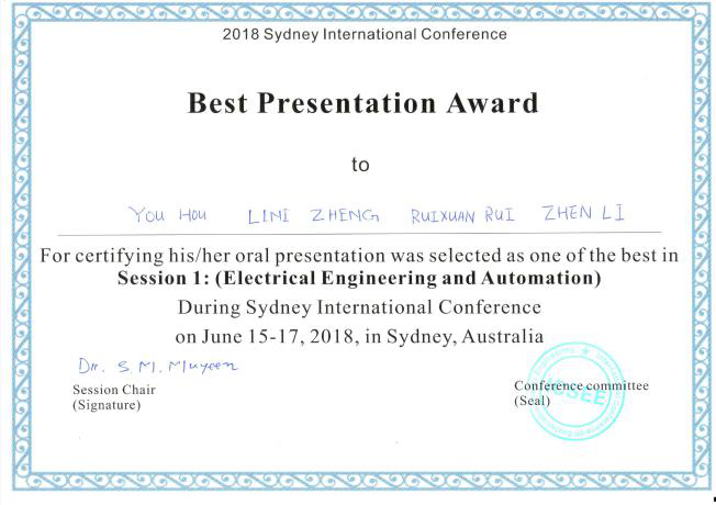 ICSEE2018由澳洲八校聯(lián)盟、新西蘭奧克蘭大學(xué)聯(lián)合主辦,是面向新能源電力系統(tǒng)領(lǐng)域的頂級學(xué)術(shù)會議之一,同時也是澳大利亞電力系統(tǒng)領(lǐng)域?qū)W術(shù)年會,此次大會共錄用120篇論文,其中15篇推薦發(fā)表至《International Journal of Smart Grid and Clean Energy》期刊(包括獲獎?wù)撐模?。大會根?jù)匿名通訊評審結(jié)果,從錄用的120篇論文中評選20篇進入嚴格的現(xiàn)場答辯環(huán)節(jié),來自澳洲新南威爾士大學(xué)IEEE Fellow Joe Dong教授、新西蘭奧克蘭大學(xué)IEEE Fellow Udaya K. Madawala教授等評委對該項研究表示了高度評價、充分肯定和鼓勵,最終本論文因其在逆變器孤島運行不平衡工況下自適應(yīng)虛擬阻抗控制方面的貢獻而獲得最佳論文獎。這是理工學(xué)子首次在電氣工程領(lǐng)域的國際會議中獲最佳論文獎項。