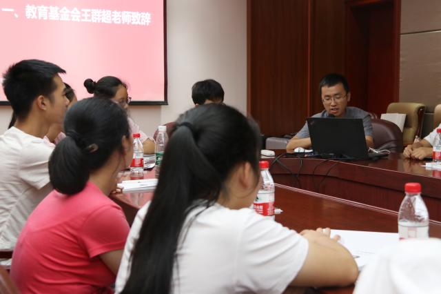 教育基金會辦公室王群超老師致辭,他歡迎大家加入北理工的溫暖大家庭,并介紹了北理工教育基金會作為在民政部注冊的4A級慈善組織,在學校建設(shè)、教學科研、學生資助等方面發(fā)揮的重要作用,并回顧了“夢想啟航”助學金的設(shè)立背景和內(nèi)涵,簡要介紹了教育基金會設(shè)立的獎助學金情況;基金會志愿者蔣子杰同學介紹了學校情況,他從北理工的歷史講起,向新生闡述了延安精神、文化傳承和科技成就等,讓師弟師妹在入學前得以充分了解學校;教育基金會辦公室高靜琦老師全面介紹了學校資助工作體系,重點講述了獎助學金設(shè)立情況以及入學后直接相關(guān)的資助政策,鼓勵新生們繼續(xù)保持刻苦努力的狀態(tài),不要為經(jīng)濟困難而擔憂,以優(yōu)異的成績來回報父母和社會。