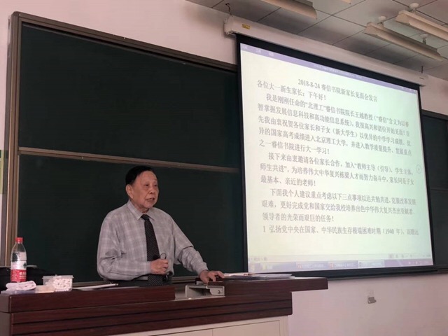 “教師主導(dǎo),學(xué)生主體,師生共進(jìn),為培養(yǎng)偉大中華復(fù)興棟梁人才而努力奮斗……”,8月24日,良鄉(xiāng)校區(qū)理教101教室,北理工“大先生”兩院院士王越先生為睿信書(shū)院2018級(jí)新生及家長(zhǎng)們帶來(lái)了“入學(xué)第一課”。講臺(tái)上86歲高齡的王越先生,精神矍鑠,敏捷的思維,精彩的講授,深深地吸引著每一位同學(xué)及家長(zhǎng)。