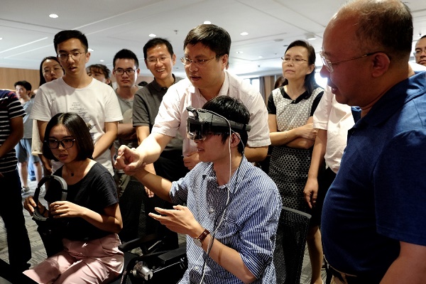 在聽取了項目負(fù)責(zé)人的匯報后,檢查組專家對項目取得的基于SLAM的穿透式頭戴無障礙呈現(xiàn)裝置和虛實(shí)融合環(huán)境的高效構(gòu)建平臺與呈現(xiàn)系統(tǒng)等階段性成果進(jìn)行了體驗與檢查。