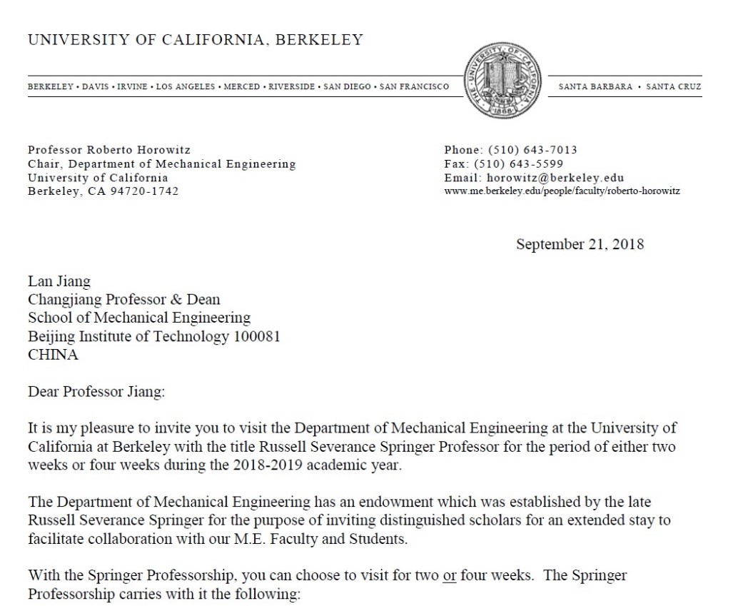 近日,北理工機(jī)械與車輛學(xué)院姜瀾教授入選美國加州大學(xué)伯克利分校Russell Severance Springer Professor(榮譽(yù)性質(zhì)的杰出教授職位)。Russell Severance Springer Professor 每年全球遴選3人,要求被提名人必須為非常杰出的學(xué)者(The nominee must be a scholar of truly eminent stature)。該榮譽(yù)職位自1964年開始授予,54年內(nèi)全球有149人入選,姜瀾教授為中國大陸地區(qū)的第二名入選學(xué)者。