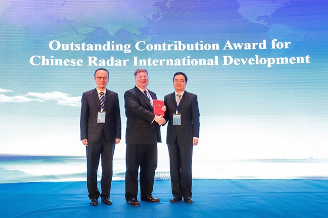開幕式致辭后,大會頒發(fā)了“中國雷達國際發(fā)展杰出貢獻獎”,由龍騰教授介紹Hugh Griffiths教授的獲獎理由,感謝其對中國雷達國際發(fā)展作出的巨大貢獻,并由中國電子學(xué)會雷達分會主任委員吳劍旗教授為其頒獎。