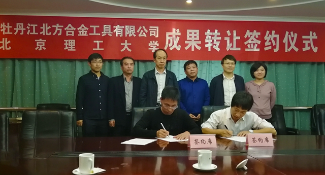 在取得創(chuàng)新成果的基礎(chǔ)上,團(tuán)隊(duì)、學(xué)院及技術(shù)轉(zhuǎn)移中心等學(xué)校相關(guān)部門研究決定,通過產(chǎn)學(xué)研結(jié)合方式,充分利用企業(yè)的生產(chǎn)和市場優(yōu)勢,加速實(shí)施成果轉(zhuǎn)化。此前,校企雙方經(jīng)過深入洽談交流,商定了通過許可方式和“入門費(fèi)+產(chǎn)值提成”模式,實(shí)施該項(xiàng)成果的轉(zhuǎn)化應(yīng)用,并履行了技術(shù)轉(zhuǎn)讓的相關(guān)審核審批手續(xù)。會(huì)上,雙方代表簽訂了協(xié)議。根據(jù)雙方達(dá)成的協(xié)議,經(jīng)學(xué)校授權(quán),牡丹江北方合金工具有限公司將負(fù)責(zé)實(shí)施該材料的產(chǎn)業(yè)化批量生產(chǎn),并直接應(yīng)用于相關(guān)產(chǎn)品。