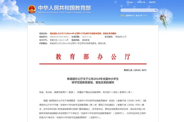 近日,教育部公布了2018年全國中小學(xué)生研學(xué)實(shí)踐教育基地、營地名單,北京理工大學(xué)光電創(chuàng)新教育實(shí)驗(yàn)基地成功入選“全國中小學(xué)生研學(xué)實(shí)踐教育基地”。此項(xiàng)遴選推薦工作于6月開展,旨在貫徹落實(shí)黨的十九大精神,發(fā)展素質(zhì)教育,進(jìn)一步落實(shí)《教育部等11部門關(guān)于推進(jìn)中小學(xué)生研學(xué)旅行的意見》,積極推動(dòng)各地中小學(xué)生研學(xué)實(shí)踐教育活動(dòng)深入開展。