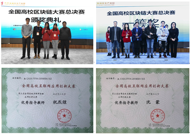 2018年12月8日,第三屆全國高?;ヂ?lián)網(wǎng)金融應(yīng)用創(chuàng)新大賽——基于區(qū)塊鏈的互聯(lián)網(wǎng)創(chuàng)新應(yīng)用總決賽在北京互聯(lián)網(wǎng)金融安全示范產(chǎn)業(yè)園成功落下帷幕。經(jīng)過來自六大賽區(qū)一等獎的20支隊伍的精彩角逐,由北理工計算機學(xué)院副院長祝烈煌教授、沈蒙副教授指導(dǎo)的參賽隊伍“837-offline”隊伍(包括:唐湘云,2016級博士;尹昊,2018級博士;史可新,2017級碩士)獲得“基于區(qū)塊鏈的互聯(lián)網(wǎng)創(chuàng)新應(yīng)用大賽”全國一等獎(獎金5萬元),兩位指導(dǎo)教師榮獲大賽優(yōu)秀指導(dǎo)教師獎。同時,北京理工大學(xué)計算機學(xué)院獲得大賽優(yōu)秀組織獎。