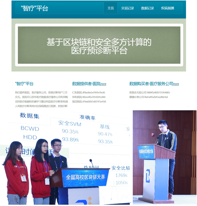 隨著人工智能和機器學(xué)習(xí)理論與技術(shù)的發(fā)展,智能醫(yī)療診斷系統(tǒng)應(yīng)運而生。病人自助式地將病情輸入醫(yī)療診斷系統(tǒng),系統(tǒng)可為病人方便快捷地返回預(yù)診斷結(jié)果。但構(gòu)建智能醫(yī)療診斷系統(tǒng)面臨醫(yī)療數(shù)據(jù)隱私安全、智能醫(yī)療診斷系統(tǒng)可信度低、病人難以對醫(yī)療診斷系統(tǒng)建立起信任三大難題。針對這些難題,我校計算機學(xué)院的“837-offline”隊伍構(gòu)建了“智療平臺:基于區(qū)塊鏈的安全智能醫(yī)療預(yù)診斷平臺”,實現(xiàn)一個分布式安全智慧醫(yī)療平臺。憑借這一作品,他們在華北分賽區(qū)斬獲一等獎之后,又經(jīng)過的全國總決賽的激烈比拼,成功攬獲全國總決賽一等獎。