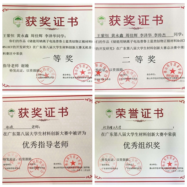 2018年12月8日至9日,由廣東省材料研究學(xué)會主辦的第八屆廣東大學(xué)生材料創(chuàng)新大賽在廣東省佛山市佛山科技學(xué)院舉行,北京理工大學(xué)材料學(xué)院?!扳c”百川代表隊參與比賽并取得無機非金屬賽區(qū)分決賽一等獎,總決賽二等獎的優(yōu)異成績,謝嫚老師獲得優(yōu)秀指導(dǎo)老師獎,北京理工大學(xué)材料學(xué)院獲優(yōu)秀組織獎。項目成果還在路演環(huán)節(jié)被今日頭條、東方財富網(wǎng)等主流媒體報道。