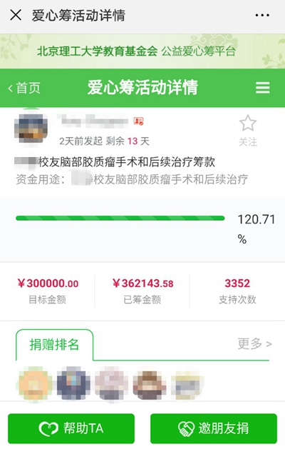 “人生總有低谷,祝愿你早日戰(zhàn)勝病魔,擁有自己理想的生活!”“加油,桃花開了,希望你每年都能看到美麗的桃花?!薄半m然不認(rèn)識,但應(yīng)該在一層樓學(xué)習(xí)了兩年。師姐加油??!”在平臺項(xiàng)目下,不少捐贈(zèng)者留下了簡短而又感人的祝福語,鼓勵(lì)這位花樣年華的同袍與病魔積極抗?fàn)帲潭?小時(shí)就完成了籌款目標(biāo)。截至發(fā)稿時(shí),該項(xiàng)目已有3353人參與,362243.58元善款匯入捐贈(zèng)賬戶,匯成一股愛的織流,實(shí)現(xiàn)120.71%的募捐效果。