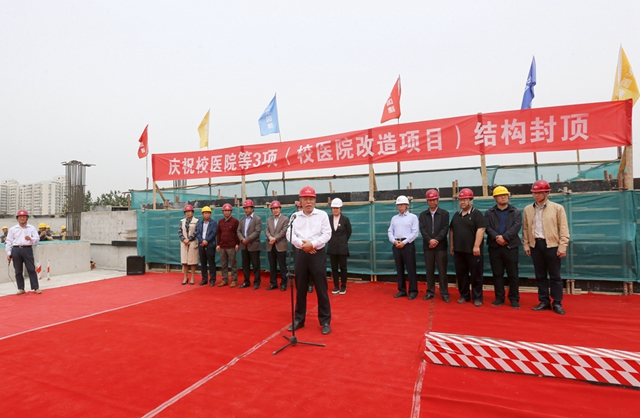 李和章代表學(xué)校致辭,對各參建單位在北京理工大學(xué)校醫(yī)院改造項目中的辛勤付出表示感謝。校醫(yī)院改造項目是學(xué)?!笆濉敝攸c(diǎn)建設(shè)項目之一,是關(guān)系到全校師生員工醫(yī)療、衛(wèi)生服務(wù)的重要民生工程。學(xué)校經(jīng)多方籌措資金,克服場地狹小、周邊環(huán)境復(fù)雜等多項不利因素,最終順利實(shí)現(xiàn)結(jié)構(gòu)封頂。學(xué)校和各參建單位將再接再厲,一道完成后續(xù)工程的施工任務(wù)。最后,李和章宣布中關(guān)村校醫(yī)院改造項目結(jié)構(gòu)封頂。