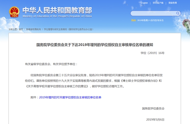 5月31日,國務院學位委員會公布了2019年獲得學位授權(quán)自主審核單位名單,我校名列其中成為全國31所擁有學位授權(quán)自主審核權(quán)的高校之一。