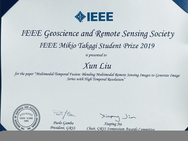 趙保軍教授、鄧宸偉教授及其指導(dǎo)博士生劉珣與法國格勒諾布爾大學Jocelyn Chanussot教授合作的論文《多模態(tài)-時序融合:綜合利用多模態(tài)圖像生成高時間分辨率遙感觀測》(Multimodal-Temporal Fusion: Blending Multimodal Remote Sensing Images to Generate Image Series with High Temporal Resolution) 在包括斯坦福大學、加州理工大學、美國航空航天局等國際知名學術(shù)與研究機構(gòu)的參賽論文中脫穎而出,獲得大會學生論文競賽“高木幹雄學生獎”(Mikio Takagi Student Prize)。高木幹雄學生獎是地球科學與遙感學術(shù)界頂級大獎之一,大會組委會從超過300篇參賽論文中初選10篇優(yōu)秀論文進入決賽,經(jīng)過會議口頭報告和IEEE地球科學與遙感委員會成員投票后,評分最高論文獲得高木幹雄學生獎。該獎項長期被歐美頂尖學府壟斷,這是自2006年該獎項創(chuàng)辦以來,首次由中國科研機構(gòu)學生獲此獎項。