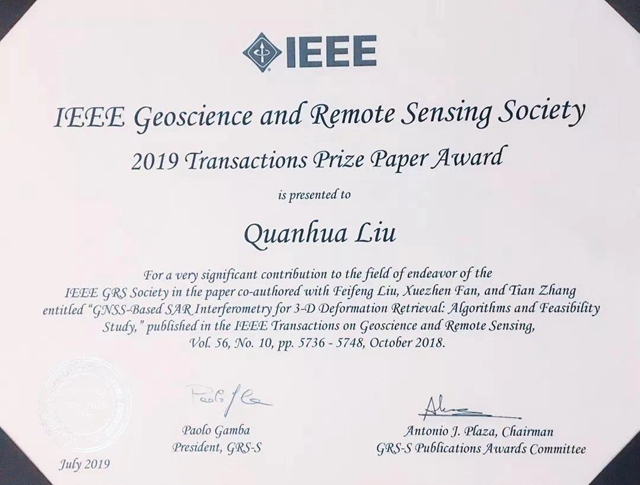 劉飛峰副教授(第一作者)、劉泉華副教授(通訊作者)及其學生范學禎、張?zhí)斓恼撐摹痘趯?dǎo)航衛(wèi)星的干涉合成孔徑雷達三維形變反演:算法與可行性研究》(GNSS-Based SAR Interferometry for 3-D Deformation Retrieval: Algorithms and Feasibility Study),獲得IEEE地球科學與遙感協(xié)會(GRSS)會刊年度論文獎(TPPA:Transactions Prize Paper Award)。該論文于2018年10月發(fā)表在本領(lǐng)域國際頂級期刊《IEEE Transactions on Geoscience and Remote Sensing》(IEEET GRS)上。IEEE TGRS期刊年度論文獎每年評選一次,評選范圍為過去一年發(fā)表的全部論文,研究工作的原創(chuàng)性、論文表述的清晰度、及時性是主要評選標準,每年度只有一篇論文獲獎。這是中國大陸科研機構(gòu)和學者1991年以來第一次獲得此獎項。