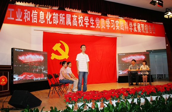 此次報告會匯集了工信部下屬7所高校學(xué)生黨員在學(xué)習(xí)實踐科學(xué)發(fā)展觀中總結(jié)的優(yōu)秀經(jīng)驗,并以報告、短劇等形式予以展示。我校共有50余名師生參加了報告會的演出,其中, 3名學(xué)生黨員代表和設(shè)計學(xué)院書記楊海濱、管理學(xué)院輔導(dǎo)員彭明雪模擬展示了我校德育答辯的精彩內(nèi)容。