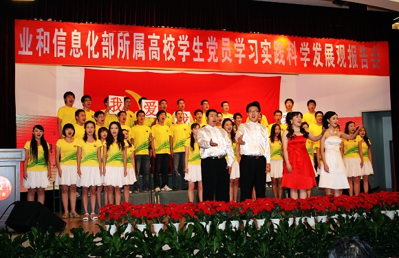 校團(tuán)委組織校合唱團(tuán)40余名同學(xué),表演了大合唱《國家》。我校師生通過精心準(zhǔn)備,將我校學(xué)生黨員在學(xué)習(xí)實踐科學(xué)發(fā)展觀活動中的先進(jìn)經(jīng)驗通過豐富多彩的形式展示在工信部和部署各高校面前,充分體現(xiàn)了我校師生的精神風(fēng)貌,得到了與會領(lǐng)導(dǎo)和師生的一致好評。
