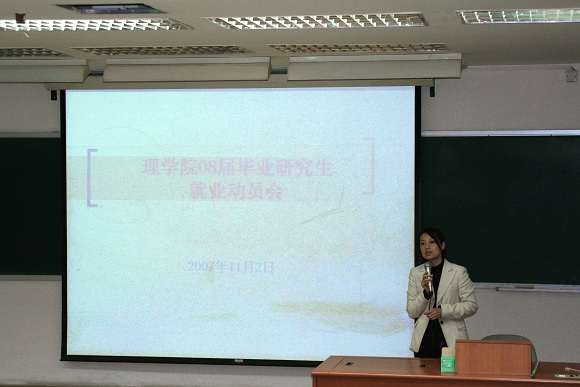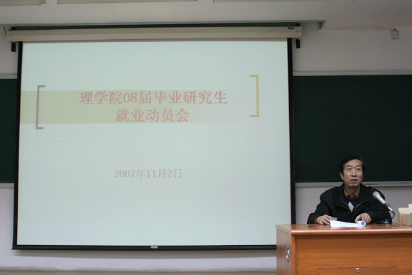 2007年11月2日,理學(xué)院學(xué)生工作組在中心教學(xué)樓307教室為2008屆畢業(yè)研究生召開就業(yè)動員大會。理學(xué)院黨委副書記、副院長姜艷老師,就業(yè)辦公室副主任王松穎老師,研究生協(xié)理員李翠英老師和理學(xué)院即將于2008年畢業(yè)的200余名研究生出席了本次大會。
