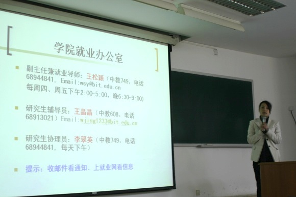 會上姜艷老師首先介紹了有關(guān)研究生就業(yè)的情況。她指出,學(xué)生的就業(yè)問題是校、院各級領(lǐng)導(dǎo)和老師長期以來都十分關(guān)心和重視的一項(xiàng)工作。為此,今年理學(xué)院還特別成立了學(xué)院就業(yè)辦公室,由姜艷老師擔(dān)任辦公室主任,王松穎老師擔(dān)任副主任兼就業(yè)導(dǎo)師,參與這項(xiàng)工作的還有研究生輔導(dǎo)員王晶晶老師和研究生協(xié)理員李翠英老師等。
