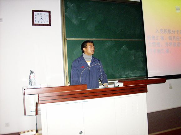 馬學(xué)會(huì)副主席關(guān)震宇做了講授了從南昌起義到長(zhǎng)征結(jié)束期間的的黨史,并對(duì)期間發(fā)生的一些重要事件做了比較詳盡的描述,引起全場(chǎng)同學(xué)的陣陣掌聲。然后,他又介紹了暑假他們參觀航天六院的情況,介紹了航天六院的科研情況及待遇等相關(guān)問(wèn)題。要求同學(xué)們認(rèn)識(shí)到咱們學(xué)校、學(xué)院的軍工特色,并鼓舞大家獻(xiàn)身國(guó)防事業(yè),為國(guó)家的軍工貢獻(xiàn)一份自己的力量。