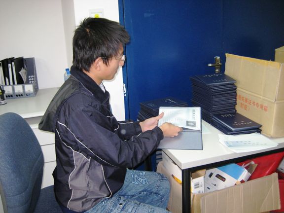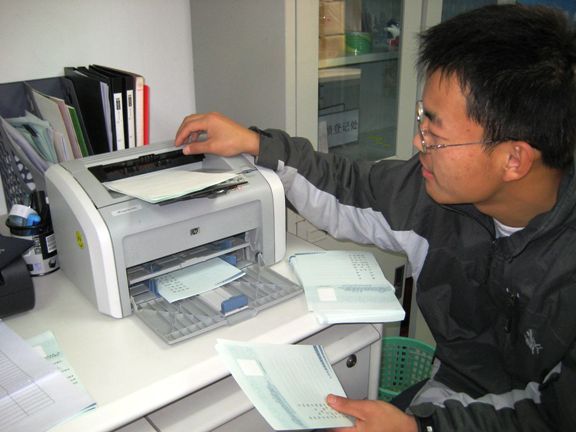 上午9:00,四位同學(xué)就來到了校素質(zhì)拓展中心,緊張地開始了工作。四位同學(xué)配合有序,分工明確。審核、打印、分裝,有條不紊地進(jìn)行著。雖然印制過程中,出現(xiàn)了不少這樣那樣的問題,但他們及時(shí)地找到相關(guān)的負(fù)責(zé)人認(rèn)真地解決。由于需要打印的份數(shù)較多,四位同學(xué)顧不上吃中飯,終于趕在下午3點(diǎn)左右印完了所有的證書。