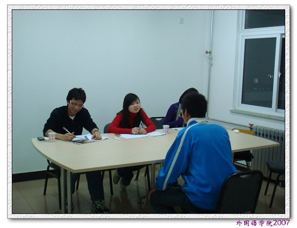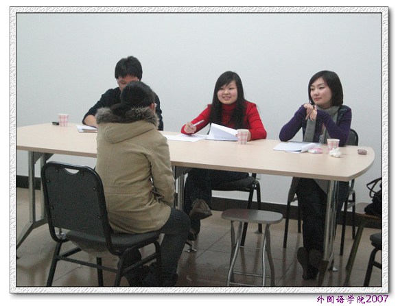 擔(dān)任此次英語口語專業(yè)測試的評委是來自外國語學(xué)院中關(guān)村校區(qū)的高年級英語專業(yè)學(xué)長,他們用專業(yè)的技能,熱情的態(tài)度,認(rèn)真的評判;參加面試的同學(xué)們也都是充滿信心和激情,很多同學(xué)很早就來到面試現(xiàn)場,積極準(zhǔn)備。經(jīng)過英語口語專業(yè)測試,外國語學(xué)院2007級選拔出20名同學(xué)參加了綜合知識考試。