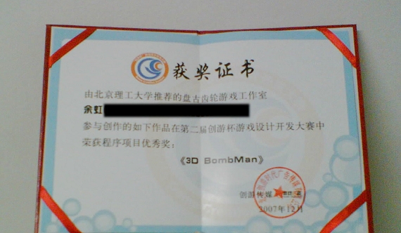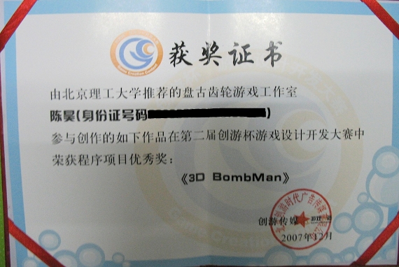 我校計(jì)算機(jī)學(xué)科學(xué)生科技創(chuàng)新基地盤(pán)古齒輪游戲工作室共選送了4件自主開(kāi)發(fā)的3D游戲,其中,陳昊、余虹、傅龍張同學(xué)的“3D BombMan”獲得程序類優(yōu)勝獎(jiǎng)。