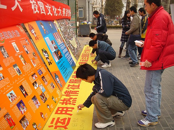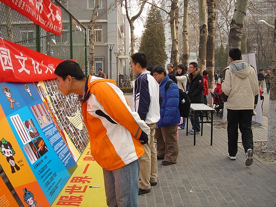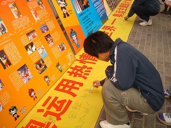 與微笑墻展出同時(shí)進(jìn)行的還有在主題條幅上簽名的活動(dòng)。很多同學(xué)簽下了自己的名字,還激動(dòng)地寫上“奧運(yùn)加油”等話語。
