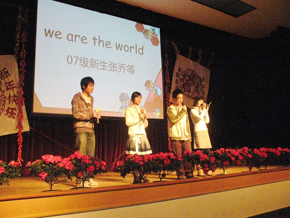 晚會現(xiàn)場熱鬧非凡,高潮迭起。多姿多彩的節(jié)目十分精彩,贏得觀眾的熱烈掌聲。其中,絕大部分的節(jié)目都是軟件學(xué)院的學(xué)生自編自演的。有來自良鄉(xiāng)的動聽旋律《We are the world》,唱出了07級的活力,唱出了軟件人的激情。
