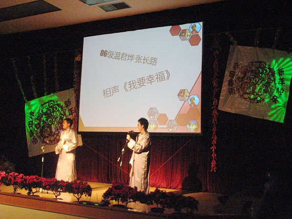 本科06級的表現(xiàn)則更加突出:讓人捧腹的相聲《我要幸?!?,把大家從繁忙的課業(yè)中解脫出來,輕松、愉悅的享受生活、體味幸福;