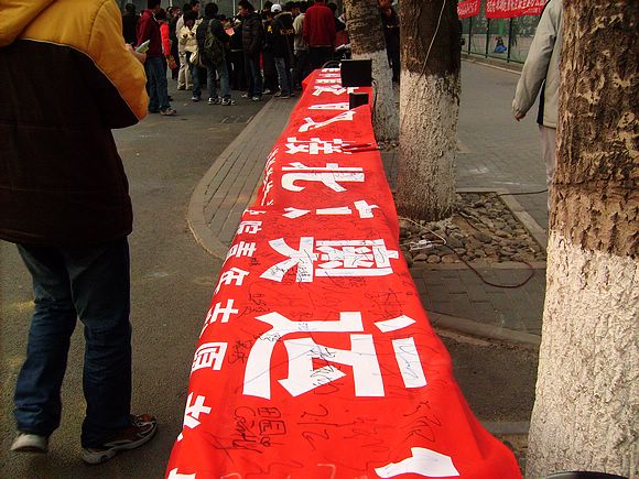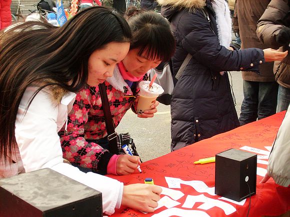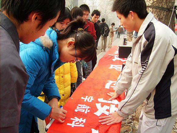 12月21日,“構(gòu)建和諧校園,迎接北京奧運(yùn)”主題文化月活動之一:倡議簽名活動在新食堂門前展開。