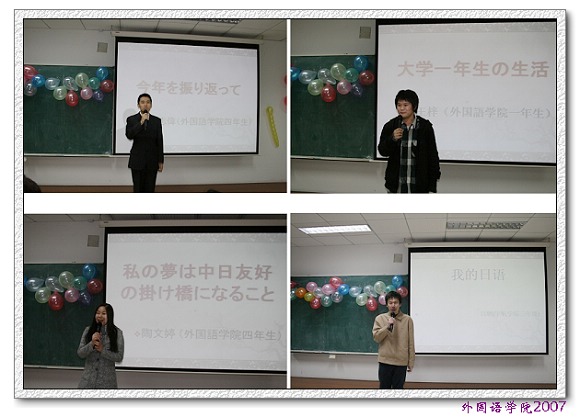 2007年12月29日,外國語學(xué)院日語系舉辦了2007年北京理工大學(xué)日語演講比賽,共有來自全校15名選手參加了比賽,其中包括日語專業(yè)11名同學(xué)和非日語專業(yè)的4名同學(xué)。此次比賽的最大亮點是在比賽中第一次出現(xiàn)非日語專業(yè)的同學(xué)。比賽吸引了全校許多日語愛好者前來觀看助威。